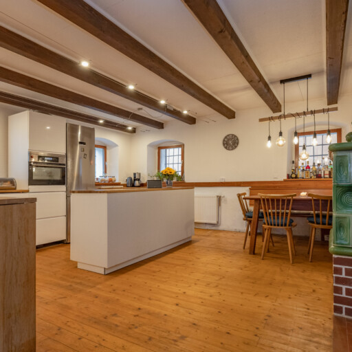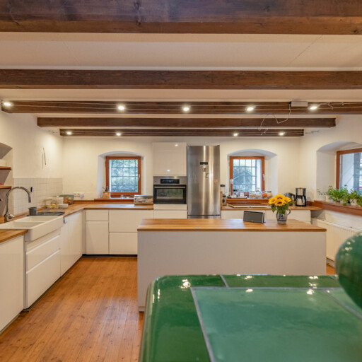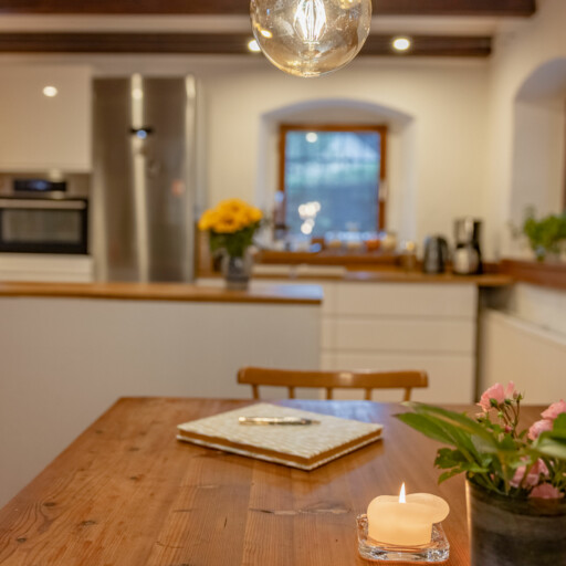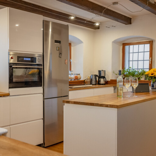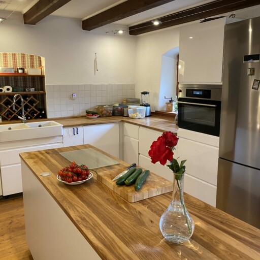 The old farmhouse kitchen renovated in a modern style (25m2) with a corner dining table for 6 people.